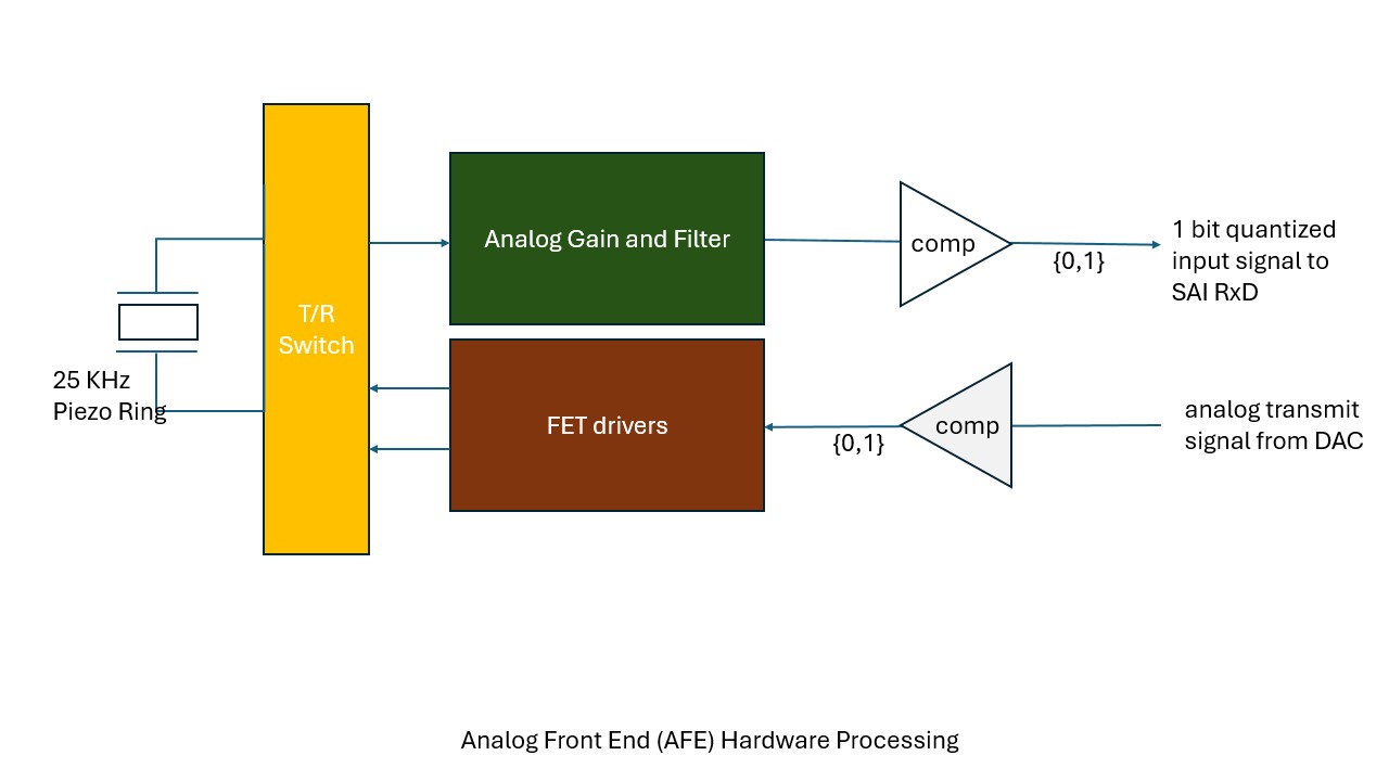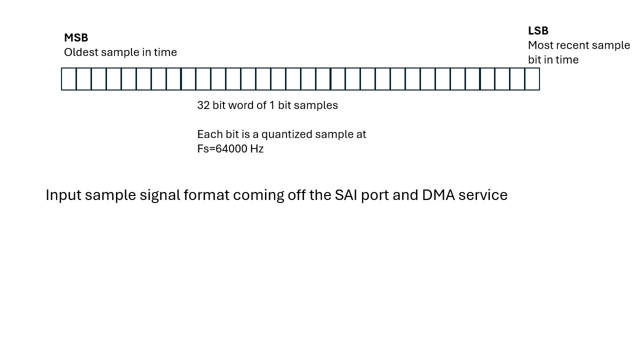 Captures the digitized 1-bit signal from the comparator at 64 kHz. Packs 32 single-bit samples into 32-bit words using circular DMA transfers. Signals the Fontus processor when half or full buffers are ready.