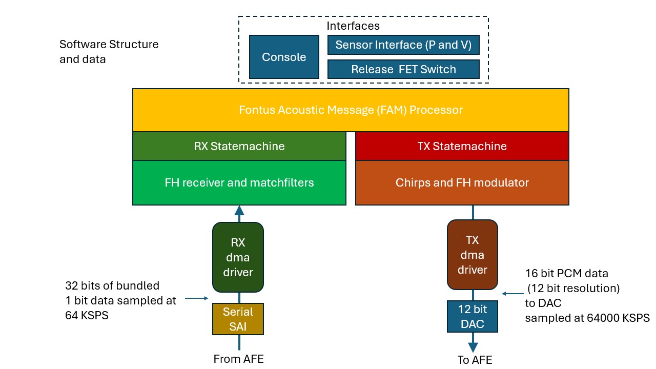 Core modem engine that implements the Fontus acoustic protocol. Contains the process data logic, hardware I/O interfaces, and Fontus bitfield structures for message handling. More details can be found on the Fontus Acoustic Messages page.